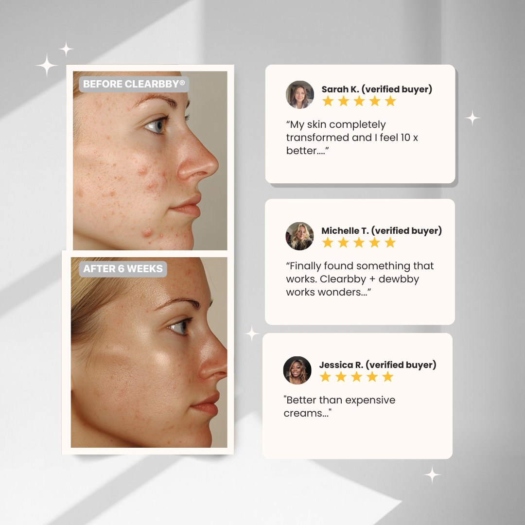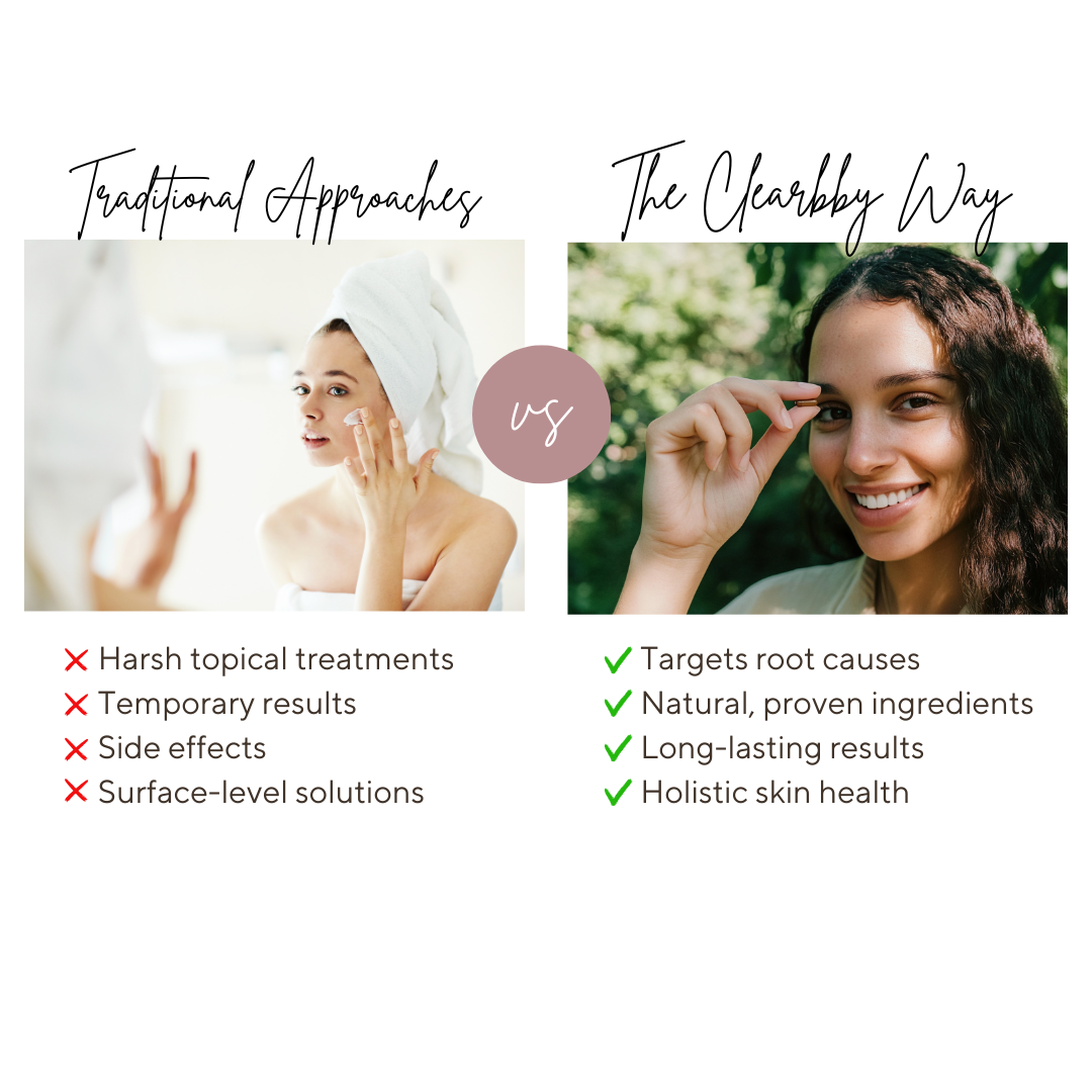 Frustrated with endless skincare products that just don't work? Clearbby® is different. Our breakthrough Clear Skin Complex targets the root cause of skin concerns by working with your body's natural processes. Experience visibly clearer, more radiant skin in as little as 4 weeks - guaranteed.