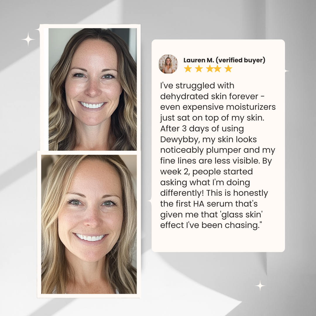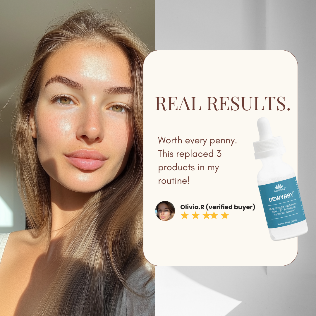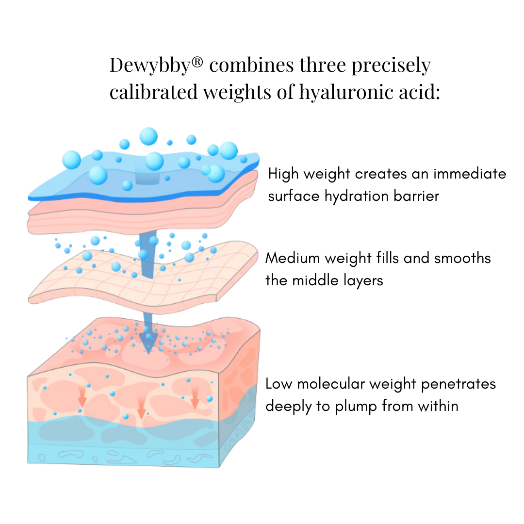 Traditional hyaluronic acid serums use only one molecular weight, limiting their ability to penetrate different skin layers. Dewybby™ combines three precisely calibrated weights of hyaluronic acid.
